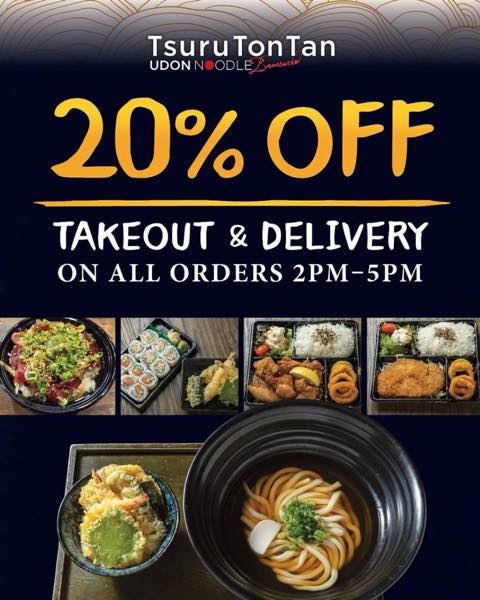 つるとんたんでは14時〜17時の間、テイクアウト・デリバリー全品が20%オフになります!