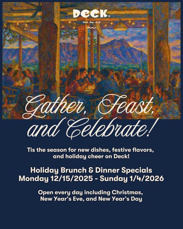 デックでは、2025年12月15日〜2026年1月4日の期間中、ホリデーディナースペシャルを提供しています。ホリデースペシャルアントレーとして、フィレミニョンやダックブレスト、プライムリブなどが登場。デックの素晴らしい景色と共に、美味しいお料理をお楽しみください!毎日6:30から営業しているので朝ごはんはもちろん、ディナータイムにもぜひご利用ください。