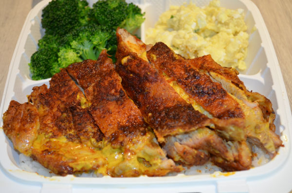 グリルドチキン、オリジナルケイジャンスパイス、ディジョンマスタード、ジャスミンライス、シグニチャーホワイトソース、ポテトサラダ、ブロッコリー。