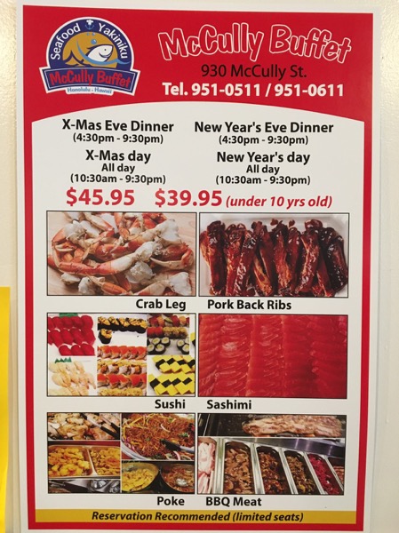 通常メニューの美味しいお刺身、お寿司、バーベキュー、ポケに加えて、大きなカニ足とジューシなーポークバックリブが追加になっています。