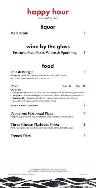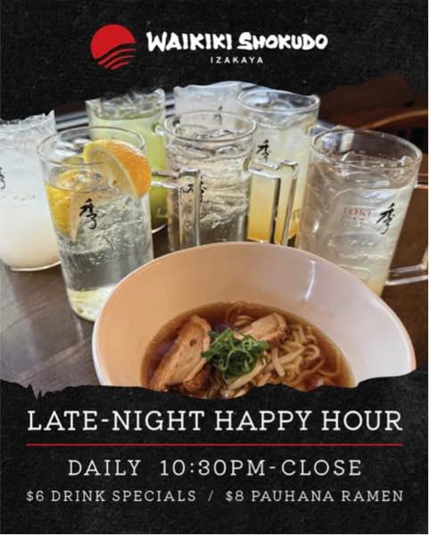 ハイボールや酎ハイなどが$6で楽しめるほか、冷製おつまみが$5に!また、22:00からのレイトハッピーアワーでは、$6のドリンクに加えてパウハナラーメン$8が登場!早めに行っても、夜遅くに行ってもお得に楽しめるのは嬉しいですね。