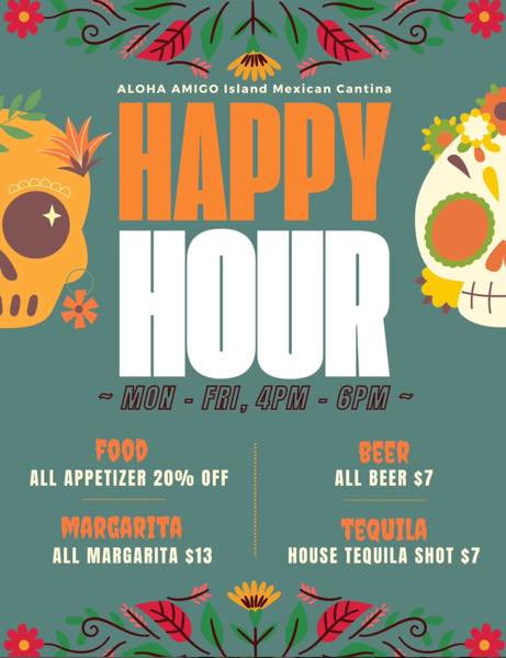 アロハアミーゴ・アイランド・メキシカン・カンティーナでは、月〜金曜の16:00〜18:00の時間帯でハッピーアワーを行なっています。