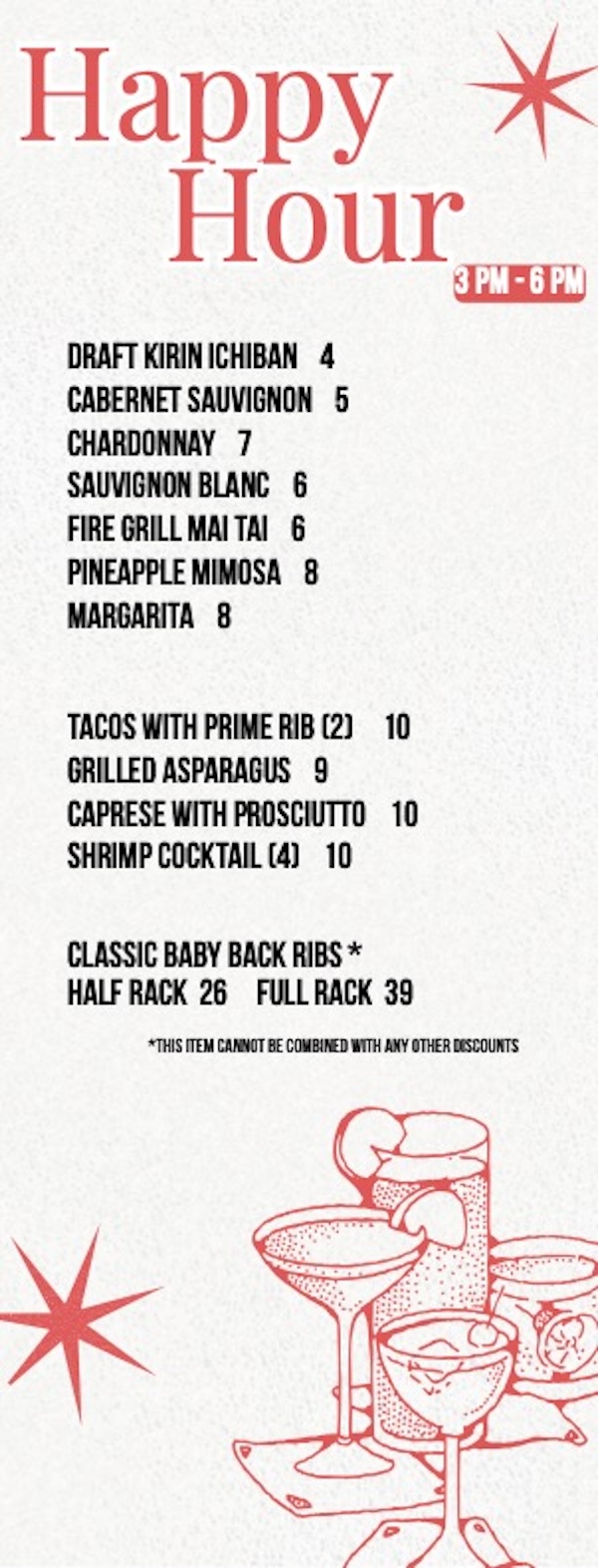 ディナー時に使えるベイビーバックリブかスモークプライムリブを注文で$10オフになるクーポンがあるのでハッピーアワー以外でもお得にお楽しみください!