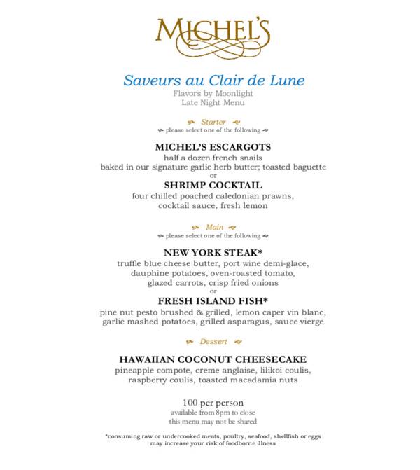 ワイキキ東部にある本格フレンチレストラン「ミッシェルズ アット コロニーサーフ」。こちらの注目は20:0021:00(ラストシーティング)のレイトハッピーアワー。20時以降に注文可能な一人$100のコース料理が、KAUKAUクーポンのご利用で$80(税・チップ別)で楽しむことができます。