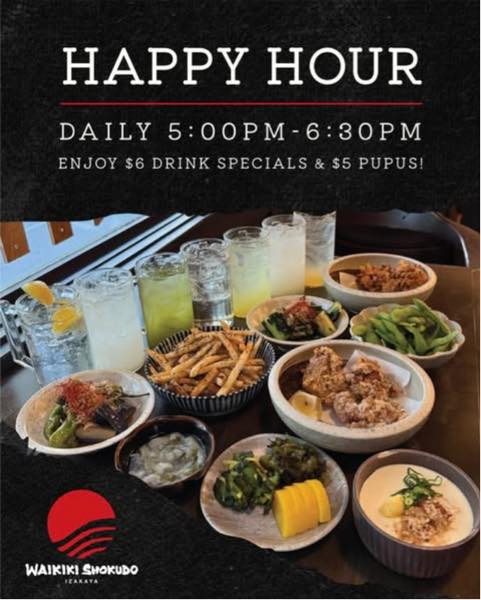 ロイヤル・ハワイアン・アベニュー沿いにある「ワイキキ食堂」は、日本でもお馴染みのおつまみやお惣菜、日本酒や焼酎などが楽しめる和食居酒屋。こちらでは17:00〜18:30、22:30〜閉店までハッピーアワーが行われています。