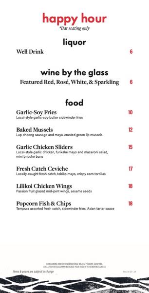 これはなかなか太っ腹ハッピーアワー!予約が取りづらいお店としても有名な人気店なのですが、ハワイ旅行の際はぜひハッピーアワーを狙って来店することをおすすめします!