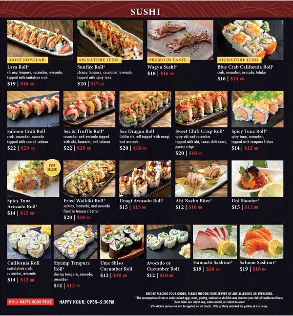 ロール寿司は$10.00〜、刺身は$18.00〜楽しめます。