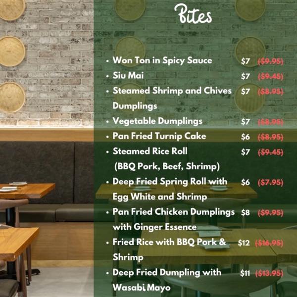 月〜金曜日のウィークデーハッピーアワーは、スパイシーソースのワンタンやシュウマイ、エビとニラの蒸し餃子、野菜餃子、大根餅、ライスロール、春巻きなどの計10品が$6から楽しめます。