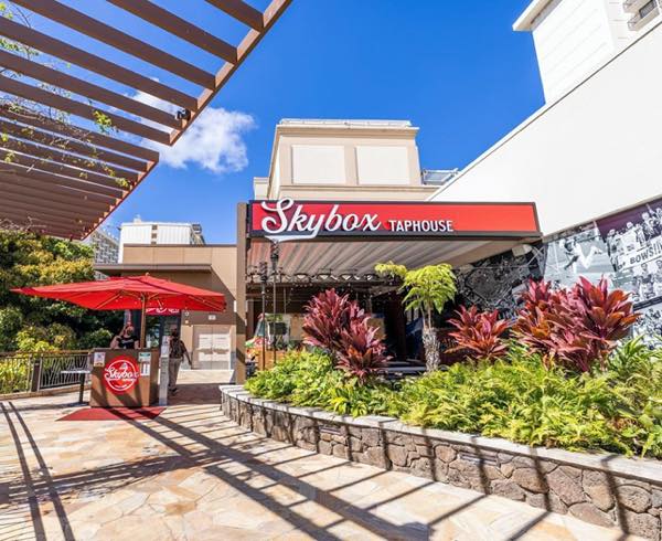 同じくインターナショナルマーケットプレイスにオープンした、スカイボックス・タップハウス。ピザやビールが楽しめるスポーツバーのようなレストランです。
