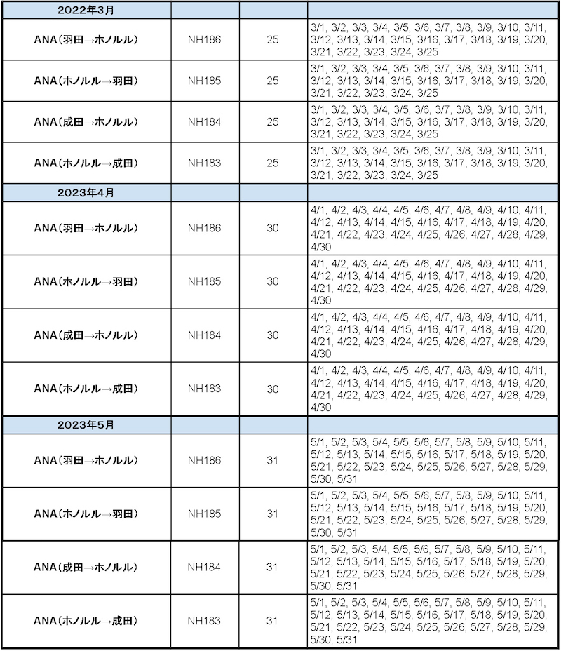 2023年6月〜2023年8月の日本ーホノルル便は下記の予定です。急に運休や変更になる便もあります。詳細は各航空会社へお問い合わせください。