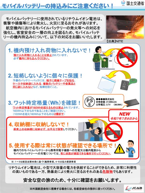 2025年7月より、モバイルバッテリーの持ち込みのルールが変更となりました。衝撃や損傷で発火し、火災に至る恐れがあるため、機内預け入れ荷物ではなく、機内に持ち込むことが必須となっています。細かいルールは以下をご確認ください。