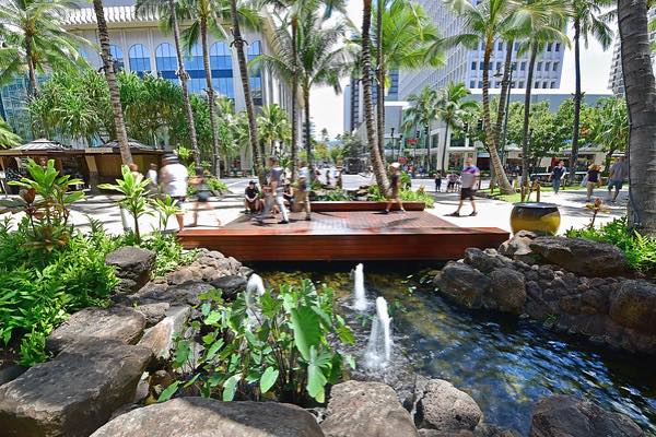ロイヤルハワイアンセンターの中心にある中庭「ロイヤルグローブ」は、そのヘルモアを再現したもので、ハワイの固有の植物があったり、池があったりとワイキキの中心にありながらハワイの自然をたっぷりと感じられる憩いの場所となっています。
