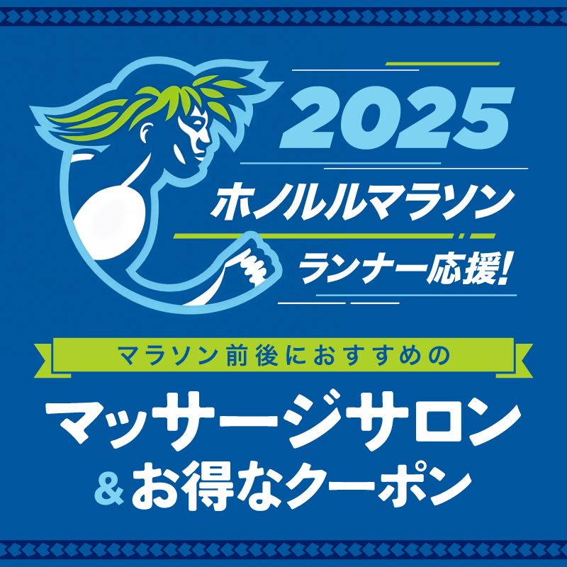 2025年のホノルルマラソンは12月14日(日)。ホノルルマラソン2025出場者におすすめのマラソン前後にマッサージが受けられるお店のクーポンをまとめました!マラソン前のコンディション調整や、マラソン後のケアにぜひこれらのクーポンを使ってマッサージを受けてみてください。
