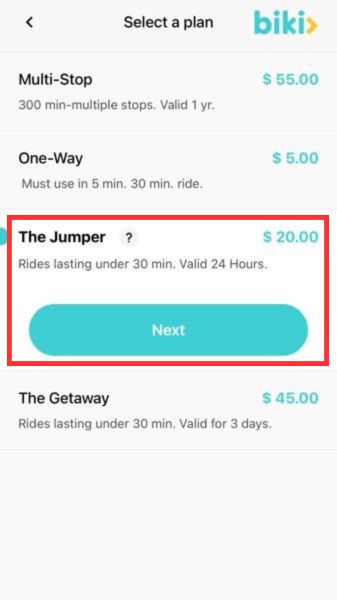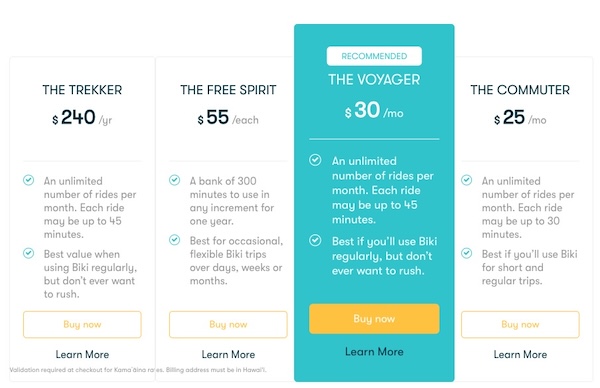 月々$15で乗り放題。1回ごとに最長30分まで乗ることができます。毎日移動にbikiを使うけど短距離移動という方は、上記のザ・ボヤージャーではなく、こちらのザ・コミューターがおすすめ。