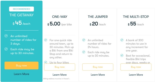 ハワイ旅行は主にbiki(ビキ)で移動、と考えている人にはこのプランがおすすめ。300分乗り放題で1年間有効です。
