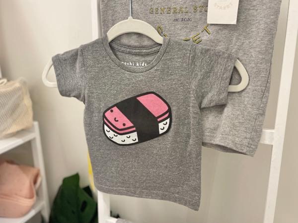 Tシャツは、Alohaと書いていたり、スパムむすびの絵が描いてあったりとハワイらしさも忘れません!Tシャツのお値段は$28.00、サイズは1〜12歳の物が揃います。子供用ですが大人顔まけのおしゃれデザインがいいですね。