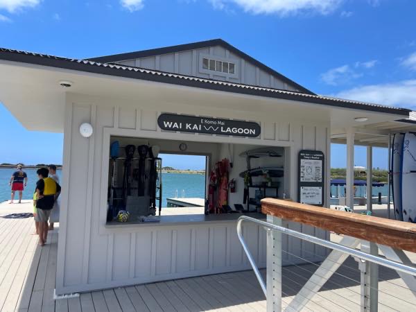 ワイカイラグーンは、海の一部を囲い作られたエリアで、波もなく穏やかなので、マリンアクティビティをするのに適しています。写真の小屋の部分にはスタッフの方がいて、ライフジャケットの貸し出しなどをしてくれます。