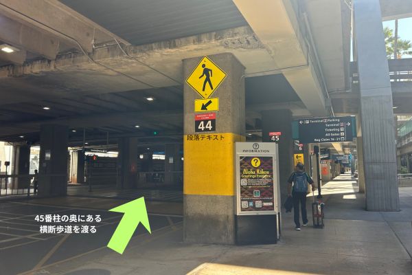 配車アプリを利用する際は、柱番号45と46の間の横断歩道を渡ると、乗り場があります。事前にアプリのダウンロードやクレジットカードなどの登録が必要です。
