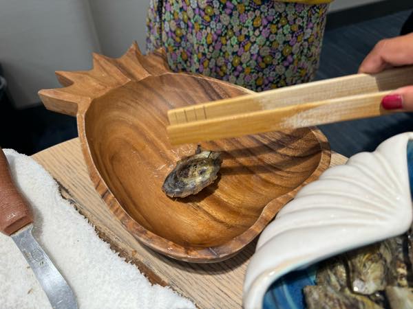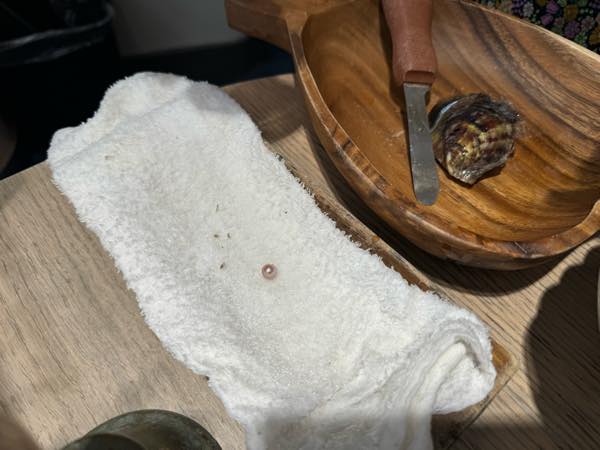 この瞬間がとっても興奮するんです。黒い貝からは想像できないほどのとっても綺麗なパールがでてくるんですよ〜!