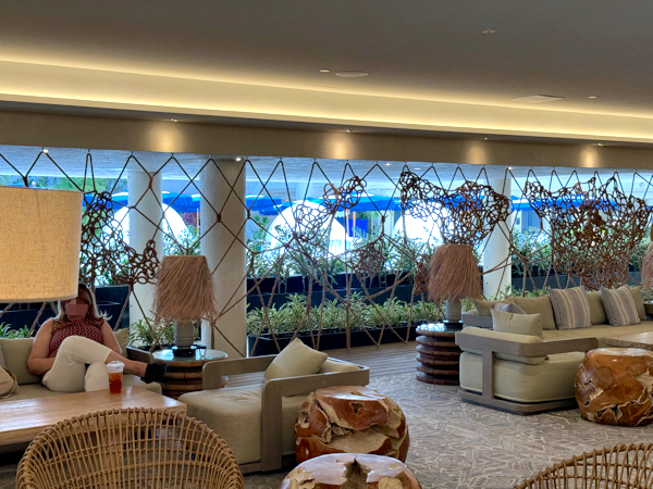 とってもオシャレでゆったり寛げるラウンジになっていて、正面には可愛いブランコ形のソファが!アウトリガーの看板もあって、これは記念写真を撮らずにはいられない映えるフォトスポットです!