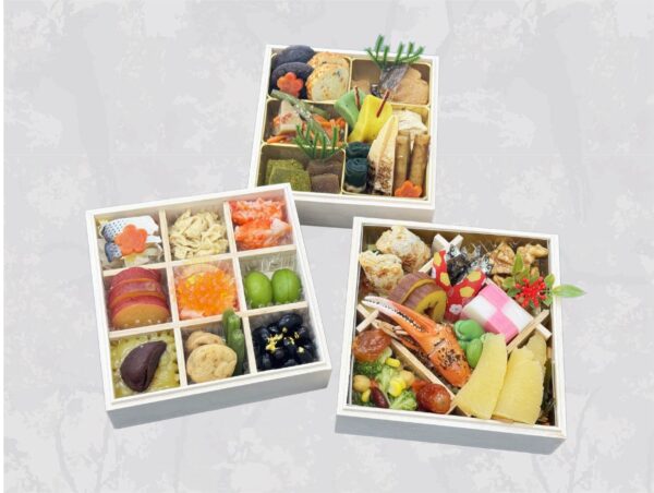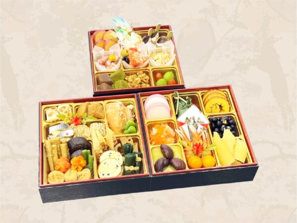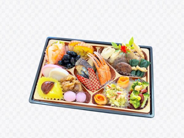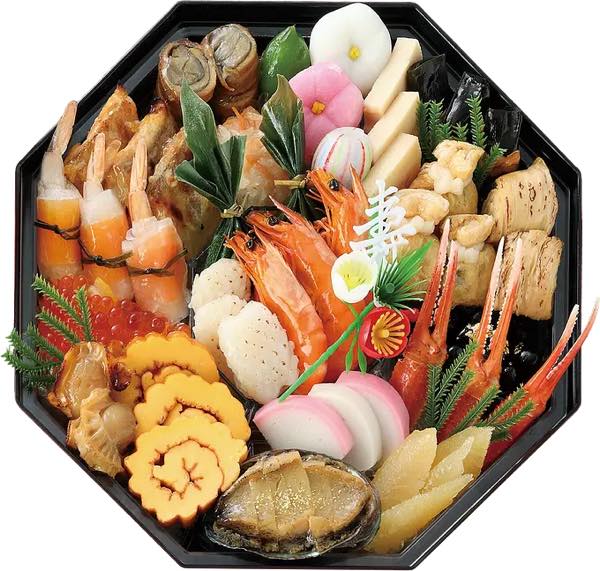 田作り、味菜の花、梅麩、手まり餅、紅白蒲鉾、きんとん、渋皮栗甘露煮、有頭海老、黒豆(金箔)、紅白なます柚子、味付けイクラ、殻付きあわび旨煮