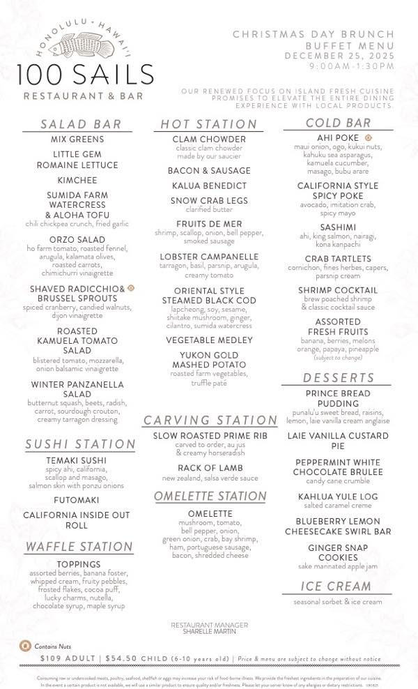 プリンスワイキキホテル3階にある「100セイルズ」は、ヨットハーバーとオーシャンビューを眺めながら食事が楽しめるレストラン。こちらでは、クリスマス当日にクリスマスブランチビュッフェ(9:00〜13:30)、24日(水)〜28日(日)はクリスマスディナー(17:00〜21:30)ビュッフェが登場します。
