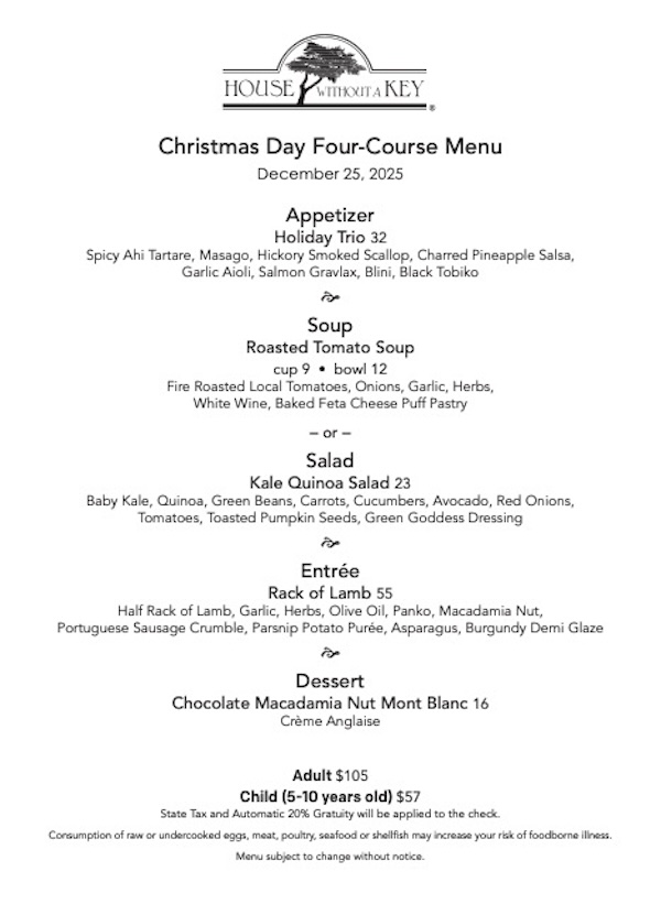 ハレクラニホテルの人気レストラン「ハウス・ウィズアウト・ア・キー」でもクリスマス当日に楽しめる4コースの特別メニューが登場。大人$105、子供(5〜10歳)$57です。