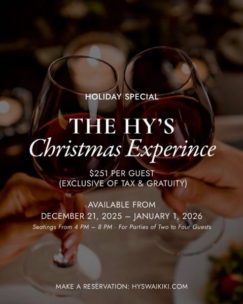 ワイキキの老舗人気ステーキレストラン「ハイズ・ステーキハウス」でも、クリスマス特別ディナーが登場。ホリデー特別プリフィクスメニューはおひとり様$251(税・チップ別)で、ハイズのシグネチャー料理やクラシックメニューが楽しめます。