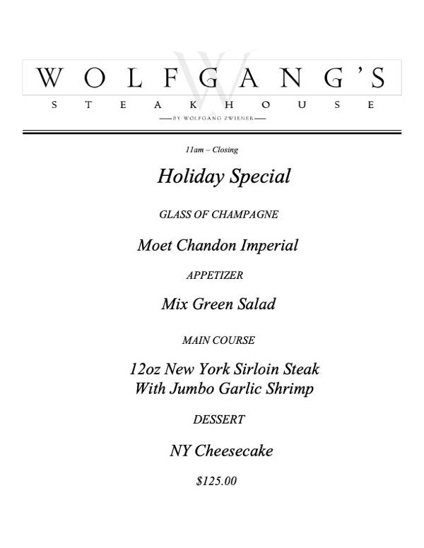 ロイヤルハワイアンセンター3階にある「ウルフギャング・ステーキハウス」から、12月24日(水)〜1月3日(土)にオーダーできるホリデースペシャルメニューが登場!お値段は1人$125です。