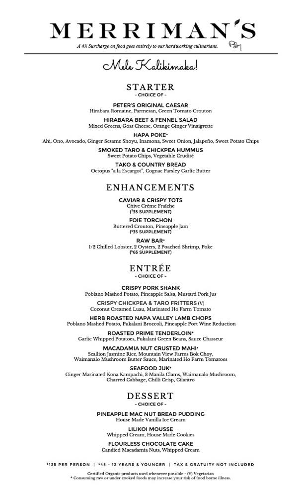 ワードビレッジにある「メリマンズ」では、12月25日限定でクリスマス特別プリフィックスメニューをご用意しています。価格は大人$135、12歳以下のお子様は$45となっています。