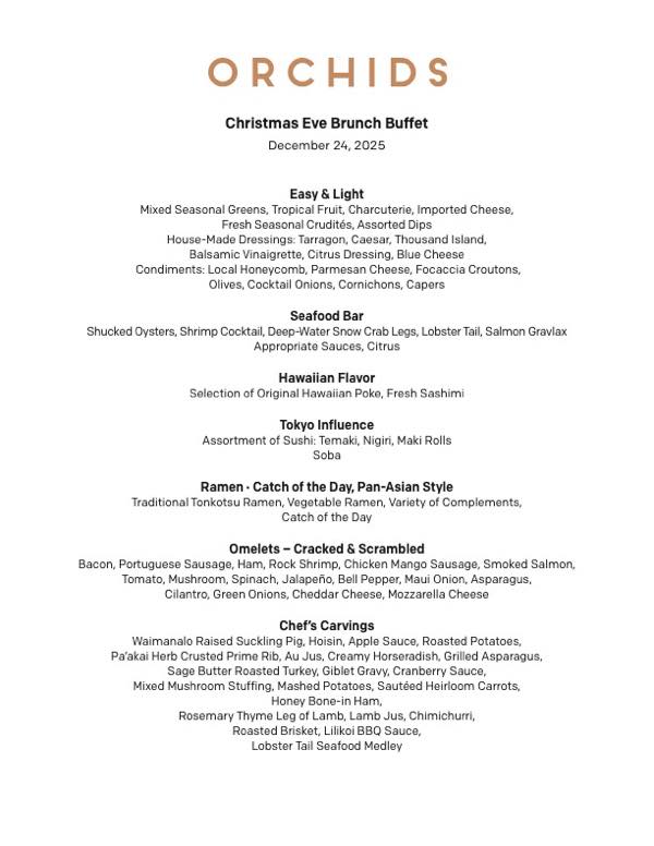クリスマスイブブランチは大人$140、子供(5〜10歳)$72、ディナーは大人$150、子供(5〜10歳)$72、クリスマスデーブランチは大人$150、子供(5〜10歳)$73、ディナーは大人$155、子供(5〜10歳)$76となっています。