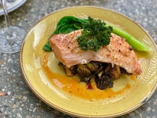 ・アペタイザー:「ビーツ・キュア・サーモン・サラダ($18)」または「炙りホタテ、クリスピー・プロスキュイットとローズ・フォーム添え($20)」