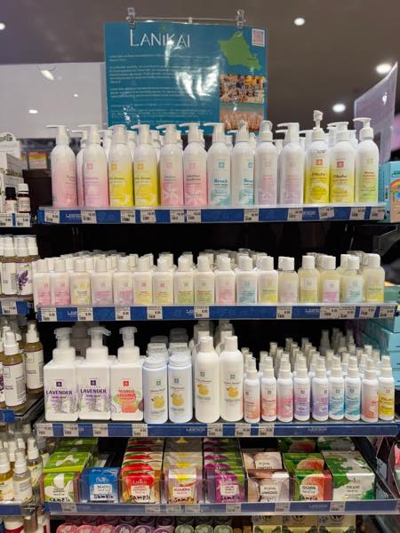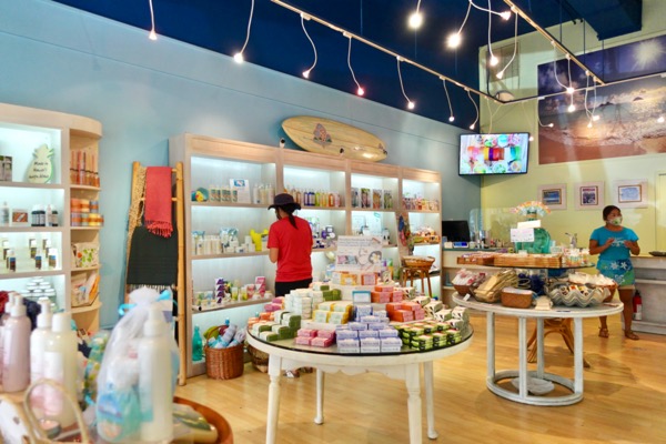 カイルアに店舗がある「ラニカイ・バス・アンド・ボディ」。ハワイ産のフルーツや植物を使って自社工場で手作りされたオーガニックの石鹸やボディケア商品が購入できます。