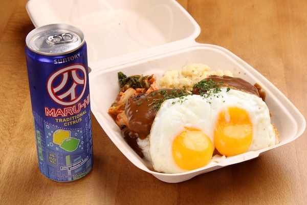 ハワイの定番ど真ん中、ロコモコのボリューム感ある味わいを受け止めるのは、マルハイのトラディショナルシトラスフレーバー。