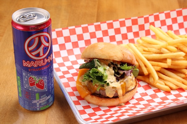 アメリカンスタイルの肉汁たっぷりのチーズバーガーに合わせるのは、ストロベリーフレーバーのマルハイ。