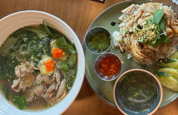 写真はシグネチャーメニューのフォー75($20.00)とハイナンチキン($23.00)。フォーは$12でオックステールを追加することもできます。