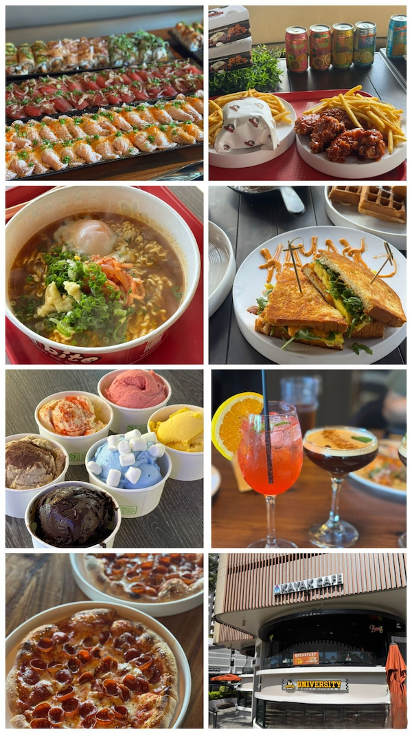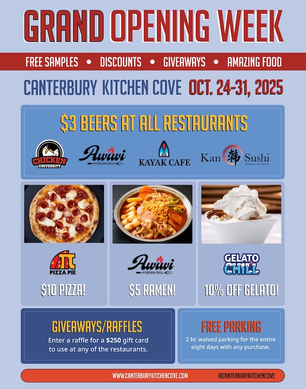 CKCには、寿司やピザ、ハンバーガー、韓国料理、ジェラートなど、ジャンルの異なる6つの人気店が勢ぞろい。総面積は約20,000平方フィート(約1,850㎡)で、100台以上の駐車場も完備しています。
