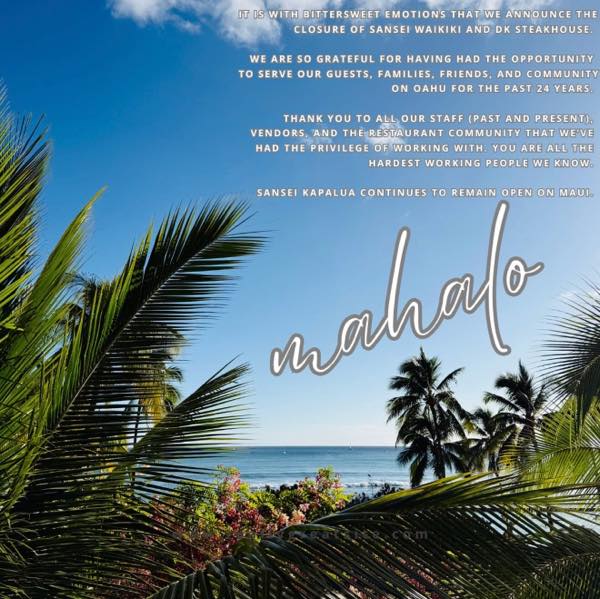 マリオットホテル内のステーキレストラン「DKステーキハウス」と姉妹店「サンセイ・シーフードレストラン&スシバー」が、8月末に突然閉店。なお、マウイ島・カパルアにある「サンセイ・シーフードレストラン&スシバー」は引き続き営業しています。従業員も閉店のわずか36時間前に知らされたとのことで、人気店の急な閉店に驚きの声が広がっています。