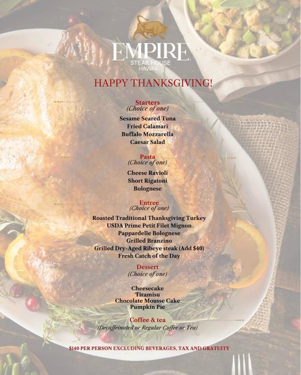 ワイキキのイリカイホテル最上階にあるステーキハウス「エンパイア・ステーキハウス・ハワイ」では、サンクスギビング特別のプリフィクスコースが登場します。