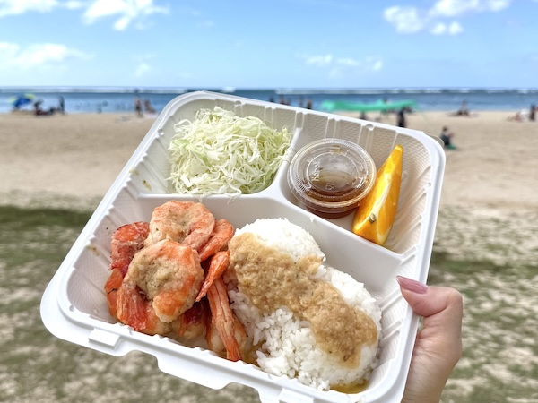 ランチついでに条件クリア。アラモアナセンター前のビーチで食べるのもオススメです!香ばしいガーリックの香りで食欲が止まりません!