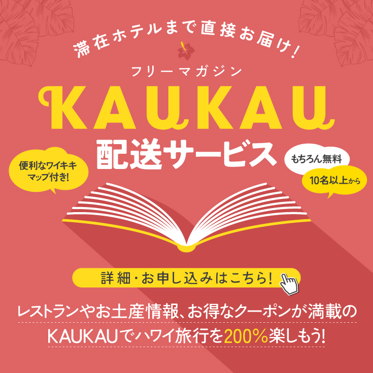 「クーポン数ハワイNo.1」のフリーペーパーとして親しまれているKAUKAUマガジンを、10名以上のグループを対象に、滞在先ホテルまで無料で配送するサービスをスタートします。ワイキキ各所のスタンドやレストランでも入手できますが、移動前に確実に手に入れておけば、初日からスムーズにハワイを楽しめますよ。