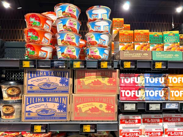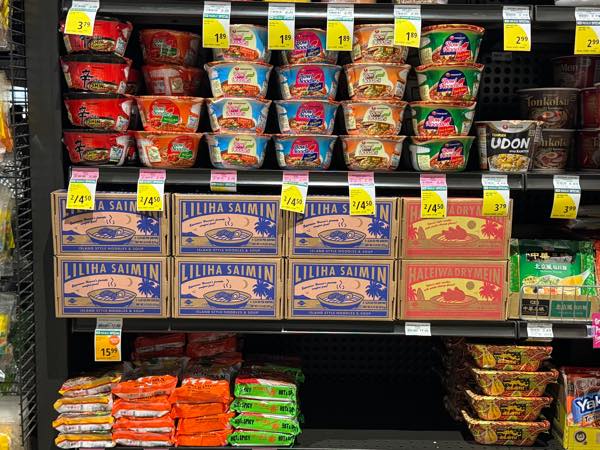 ワイキキマーケットでは、カップ麺などが並ぶ棚にディスプレイされています。パッケージの存在感が抜群なのですぐ見つけられますよ!