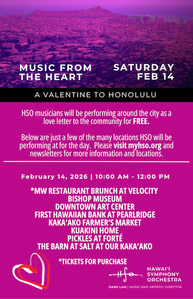 この企画について、HSOのプレジデント兼CEOを務めるエイミー・イワノ氏は、「『Music from the Heart』は、私たちを支えてくれているコミュニティへの“ありがとう”の気持ちです。交響楽団の音楽は、ステージの上だけでなく、ホノルルの街や日常の中にもあります。バレンタインデーに、音楽の楽しさをみなさんと分かち合えることをうれしく思います」と話しています。