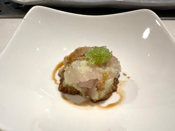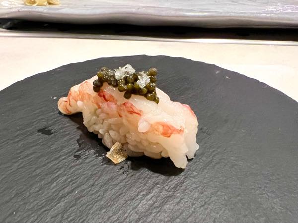 次は甘エビ。しかもキャビアが乗ったリッチなビジュアル!甘エビの上品な旨みと甘みをキャビアの塩味が引き立て、すべての素材が口の中でトロけていく…。取材中だったのでお酒は飲まなかったのですが、これは日本酒が進む美味しさです。