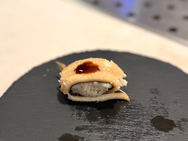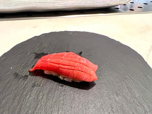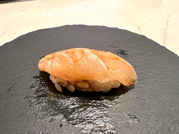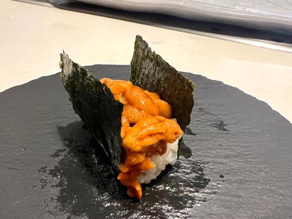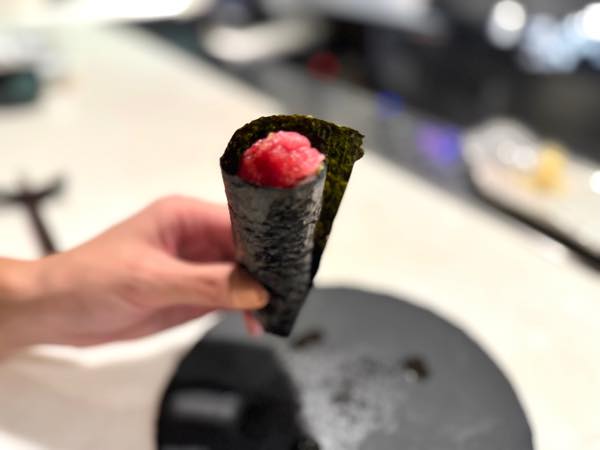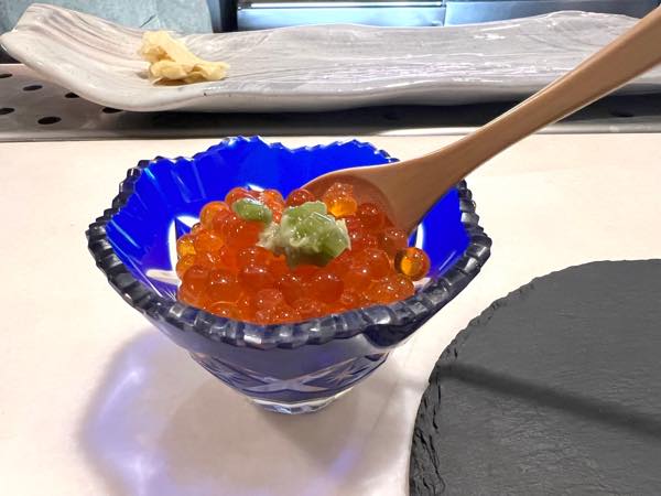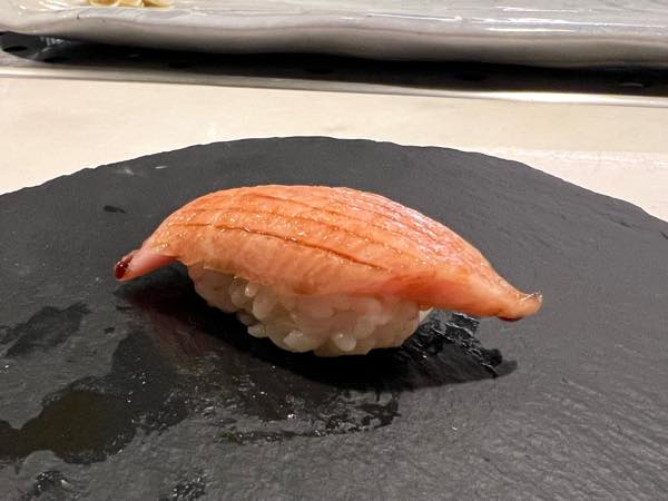 そして、ノドグロ!ハワイでノドグロのお寿司が食べられるなんてちょっとすごくないですか?!軽く炙ってあって香ばしさと甘さのバランスがまさにパーフェクト。おまかせ寿司16品の構成は、仕入れによって多少変わることもあるそうですが、ノドグロや大トロなどの横綱級のネタ、ウニやイクラなど王道人気も押さえつつ、多くのお客様に喜んでもらえるよう、バランスを見て16品の流れを決めているのだそう。日本人だと、例えばイカやホタテなどから始まって、トロや巻物で締める…といった、お寿司のセオリーがわかっている人も多いので、そうした「お決まり感」をいい意味で裏切るようなネタの出し方、味わい方で、楽しんでもらえるよう毎回、趣向を凝らしておまかせ寿司を組み立てているのだとか。