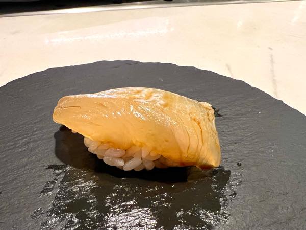 畳み掛けるように中トロ、大トロと贅沢な握りが続いて、一口食べるたびにネタに施された職人の仕事、細やかな味の仕掛けが口の中に広がり、もう多幸感が止まりません。そして、大トロの後に沖縄産もずく酢で一度口の中をリセット。大トロが出てきたらコースはもう最終コーナーかなと思いきや、まだまだ続くのが大亀さんのおまかせ寿司。ここからまた、主役級のネタが続々と登場します。