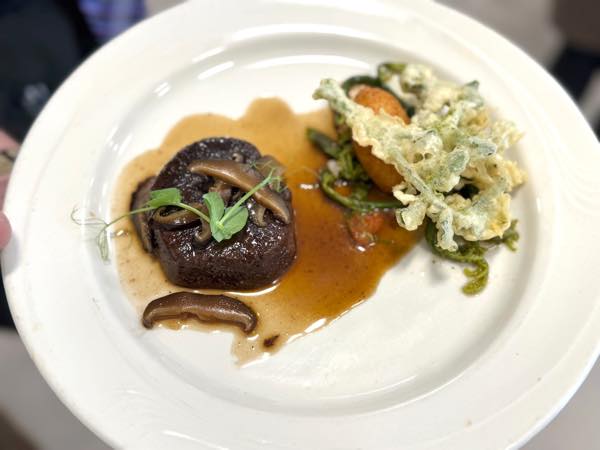 有機・原木しいたけのアニス香るジュレ、わらびとトマトサルサ、トリュフ香るドフィーヌポテト、 すみだファームのクレソンの米ぬか油天ぷらを添えて。 八女抹茶と萩塩で仕上げ