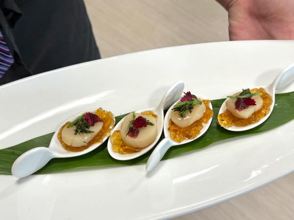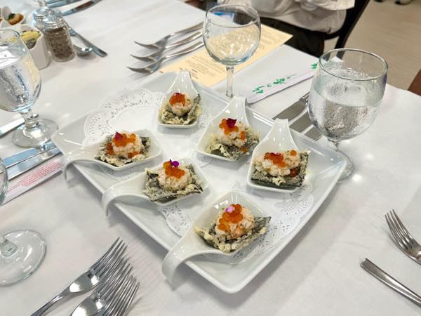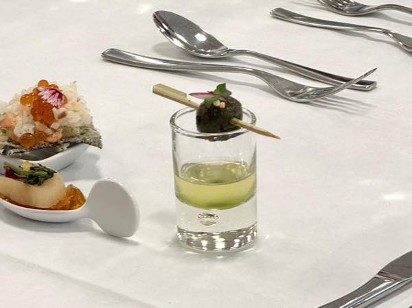 この日振る舞われたのは、日本の食品メーカー10社の食材を使い、KCCの学生シェフ15名が創作した5コースランチ。料理人の卵たちが、日本産食材の魅力をどのように表現するのか楽しみな一方で、学生達にとって、このイベントは大きな学びの場でもあります。自分たちが考案したメニューを一流のシェフ達に食べてもらうという貴重な機会は、学生達の大きなモチベーションとなり、そこで得られた経験や手応えは実習や座学でも得られない生徒達の自信となっていくでしょう。こうしたリアルなイベントを通して、これまでにない教育・指導の機会を作る、という社会貢献的な側面もこのイベントの魅力の一つと言えます。