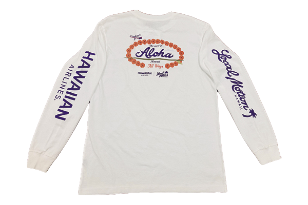ハワイアン航空メローカルモーションの特別コラボ!レイ・ナルを軸に、コーポレートカラーと調和したデザイン。$36/サイズ:S〜2XL
