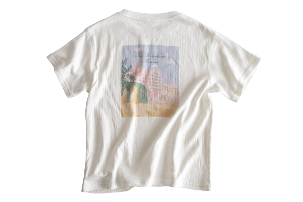通称「ピンクパレス」と呼ばれる、ロイヤルハワイアンホテルの手書き風のイラストを背中にプリントした人気Tシャツ!$54